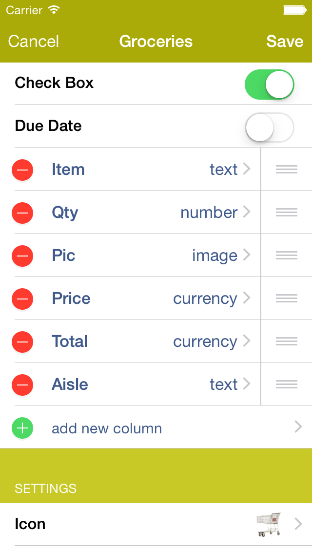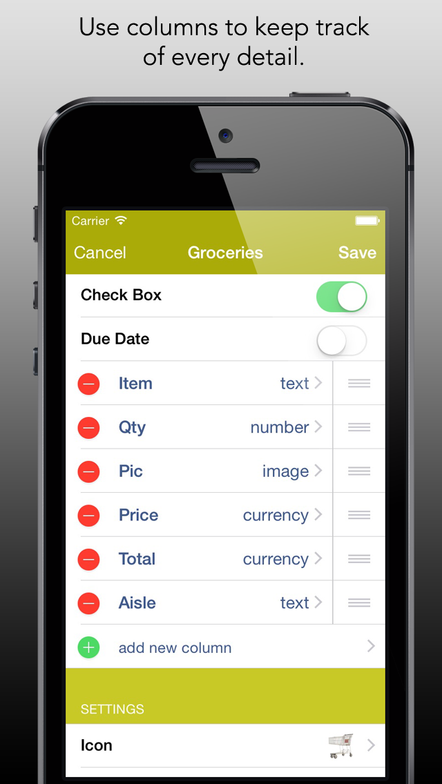 You can choose from many types for each column - text, numbers, dates, images, switches, ratings, etc etc